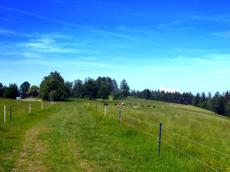 Wir bleiben vorerst weiterhin in Österreich und kommen nach ein paar Minuten wieder in einen Sattel mit Querungsmöglichkeit nach Slowenien. Dort können wir wählen, ob wir für den Weiterweg wieder eine Grenzüberschreitung wagen, oder eben diesseits weitergehen (schön sind beide Wege); im nächsten Sattel (Durchlass) vereinen sich unsere beiden Wanderwege. Diesmal bleiben wir auf der österreichischen Seite, um kurz bergauf zu einer schönen Wiese mit entsprechender Aussicht zu steigen. Gleich darauf erreichen wir wieder die Grenze, diesmal gehen wir geradeaus auf der slowenischen Seite weiter und stehen alsbald beim ehemaligen slowenischen Grenzhaus des Übergangs Arnfels – Kapla.