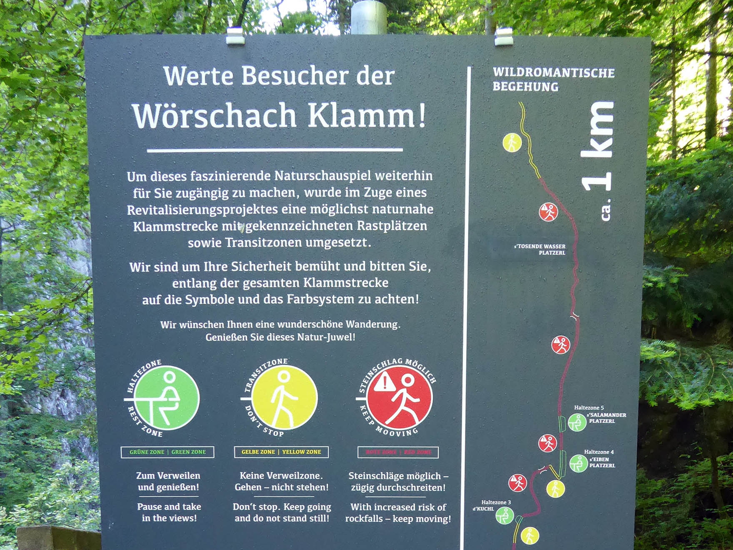 Vom etwas außerhalb der Ortschaft gelegenen Bahnhof Wörschach Schwefelbad spazieren wir entlang der Straße, die Ennstal-Straße unterquerend, nach Wörschach; nach dem Ortszentrum zeigen uns die Wegweiser den Weiterweg zur Wörschachklamm an, indem wir links abbiegen und ins Wörschachbachtal hineinwandern. Alsbald ist das Klammstüberl erreicht, wo wir den Obulus für den Klammbesuch entrichten, über die Verhaltensregeln in der Klamm informiert werden und uns auch ein wenig stärken können. Danach steigen wir durch die beeindruckende Klamm, die nach einer fast zweijährigen Sperre ab der Saison 2022 wieder besucht werden darf. Nach ca. einem Kilometer Staunen und Schauen stehen wir am oberen Klammende und folgen dem sehr gut ausgeschilderten Steig entlang des Wörschachbaches talaufwärts. Einmal noch erleben wir ein wenig Klammcharakter: Nach der Brücke mit dem Hinweis „Junggesellen-Steig 2017“ kommen wir an einem hübschen Wasserfall vorbei – inklusiver wertvoller Verhaltenstipps ;-). Auch danach bleibt der Wanderweg dem Wörschachbachgraben treu, bis er auf ca. 960m in einen Güterweg einmündet. Dort können wir uns entscheiden: entweder linkerhand entlang des Waldwegs zum Spechtensee zu wandern, oder nach rechts dem Straßerl durch die schöne Kulturlandschaft des hinteren Teils von Wörschachwald zur Spechtenseehütte zu folgen.