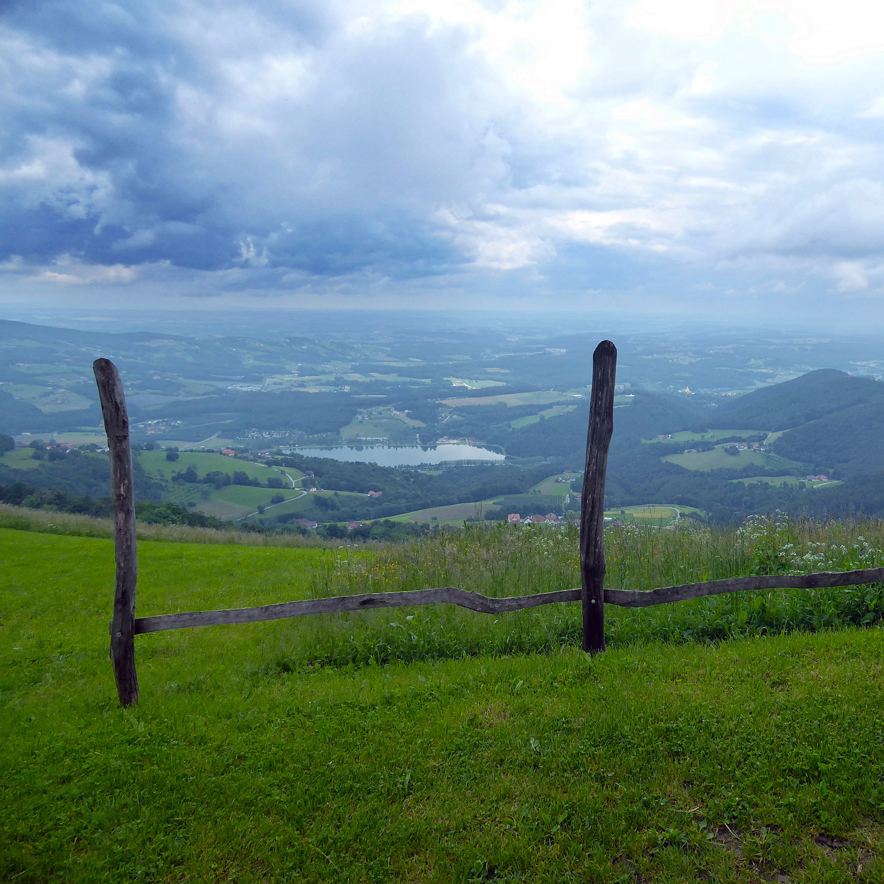 Hinter der Gipfelkapelle beginnt der steile Abstieg Richtung Südosten, alsbald verlassen wir das Gipfelareal durch ein Drehkreuz und wandern entlang eines schönen Waldweges, einmal die asphaltierte Kulmstraße querend, bis wir zu einer Wiese gelangen. Den Wegweiser Richtung Pischelsdorf am Kulm ignorieren wir und gehen geradeaus weiter durch den Wald zur nächsten Wiese. Über diese schreiten wir kurz bergab und sehen bald linkerhand die grünen Wegweiser („Geierwand/Hl. Grab“ etc.). Ein wenig später durchschreiten wir eine kleine, teils ursprüngliche Hofgruppe und erreichen danach die Straße Stubenberg – Siegersdorf. Hier wenden wir uns nach rechts (Richtung Siegersdorf), alsbald zweigen wir scharf links ab (Wegweiser „Geierwand“ etc.) und fädeln daraufhin in den Waldweg ein, der in wenigen Minuten zur Geierwand führt. Von diesem, mit einer Fahne und Holzwegweiser inszeniertem Aussichtspunkt ergeben sich spektakuläre Blicke zum Stubenbergsee und zur Feistritzklamm. Wenn wir unseren Wanderweg weitergehen, erreichen wir die Straße bei der Siedlung Klamm. Bei einem Einfamilienhaus verlassen wir diese gleich wieder (Wegweiser) und schreiten entlang des Wanderweges zum nächsten Aussichtspunkt, nämlich zur beeindruckenden Felskanzel Kranzl. Dort begeistern vor allem die Blicke zum Schloss Herberstein sowie zur Kirche St. Johann bei Herberstein. Unsere Wanderung führt danach zu einem Weingarten und von dort weiter zum malerischen Ensemble „Heiligengrab“ (auch dort können wir uns mit Getränken stärken). Entlang eines Kreuzweges (der dritte dieser Wanderung) gelangen wir nun nach St. Johann bei Herberstein, wo im hübschen Dorfzentrum (mit dem Landgut Riegerbauer) die „älteste Barockkirche der Oststeiermark“ (so der Kirchenführer) besuchenswert ist. Von der Kirche marschieren wir in wenigen Minuten hinab in den Ortsteil Dörfl, in dem neben dem Gasthof Bachwirt auch der Endpunkt unserer Wanderung, die Bushaltestelle „St. Johann bei Herberstein – Dörfl“ situiert ist.
