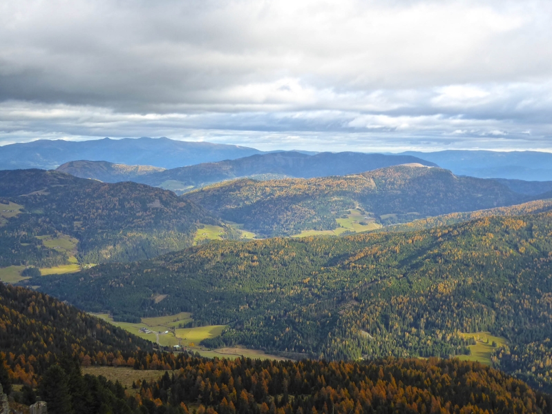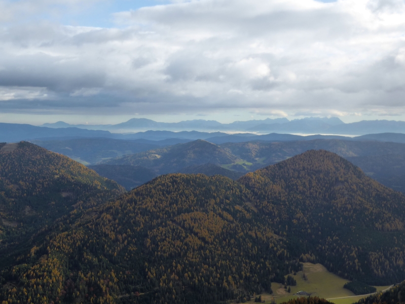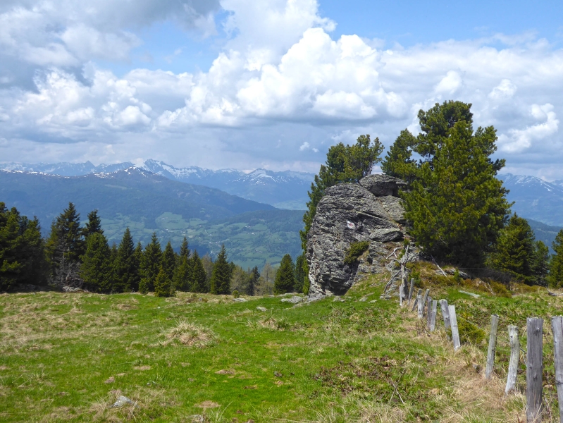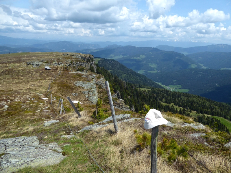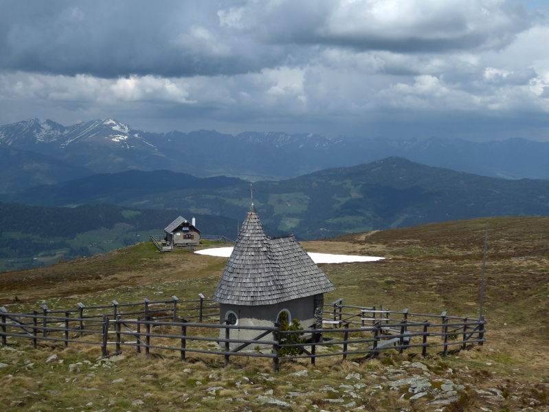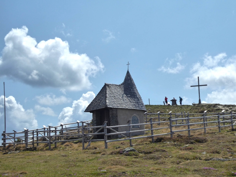 Beim Murmelfelsen, einem markanten Felsofen, stoßen wir auf eine weitere Wegkreuzung; der Hinweis „Frauenalpe Gipfel 30 Minuten“, ist gar pessimistisch, die ca. 100 verbleibenden Höhenmeter sollten in wenigen Minuten zu schaffen sein. Auf dem Gipfel der Frauenalpe stehen neben einem großen Gipfelkreuz auch eine kleine Kapelle und einige Bankerln, die zur verdienten Rast und zum umfassenden Panoramagenuss einladen (vor allem die Blicke zu den nahen Wölzer und Schladminger Tauern beeindrucken; an klaren Tagen reicht die Fernsicht über Kärnten zu den Kamniške und Julijske Alpe im Süden).