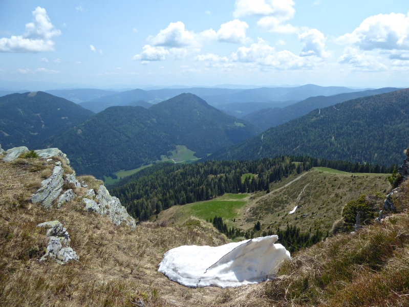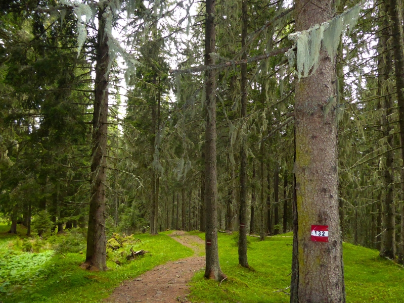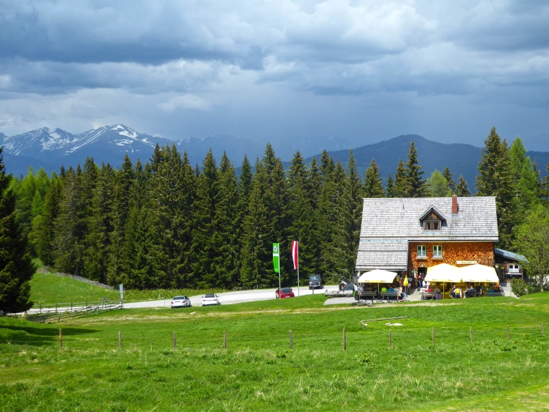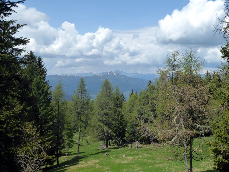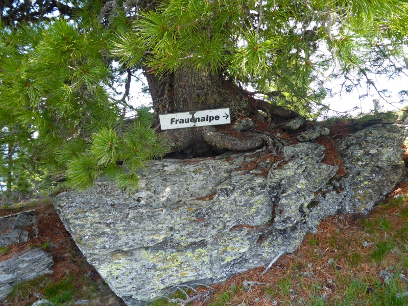 Nach der Grazerhütte (Wegweiser) führen die Markierungen entlang eines breiten Waldweges zu einer kleinen Waldlichtung, an deren oberen Ende beginnt ein Steig, über dem wir durch einen schönen Hochwald, mehrmals Fortstraßen querend, zu einer Jagdhütte und Wildfütterstelle wandern. Etwas später gelangen wir zu einer kleinen Almfläche, über die es bergauf geht und von der sich erstmals schöne Blicke in die Schladminger Tauern (Kasereck, Preber und Roteck) ergeben. Oberhalb der Almfläche erreichen wir die Wegkreuzung mit dem Weitwanderweg 09 (Wegweiser in Richtung Schwarmbrunnhöhe, Esebeckhütte und Flattnitz und natürlich Frauenalpe). Kurz steigen wir über Almflächen wieder bergan und folgen der Forststraße bis knapp vor die Troghütte, um links abbiegend hinauf zu einem breiten Höhenrücken zu gelangen (inzwischen haben sich zu den Fichten und Lärchen auch Zirben gesellt, die auf die nahe Waldgrenze hinweisen).
