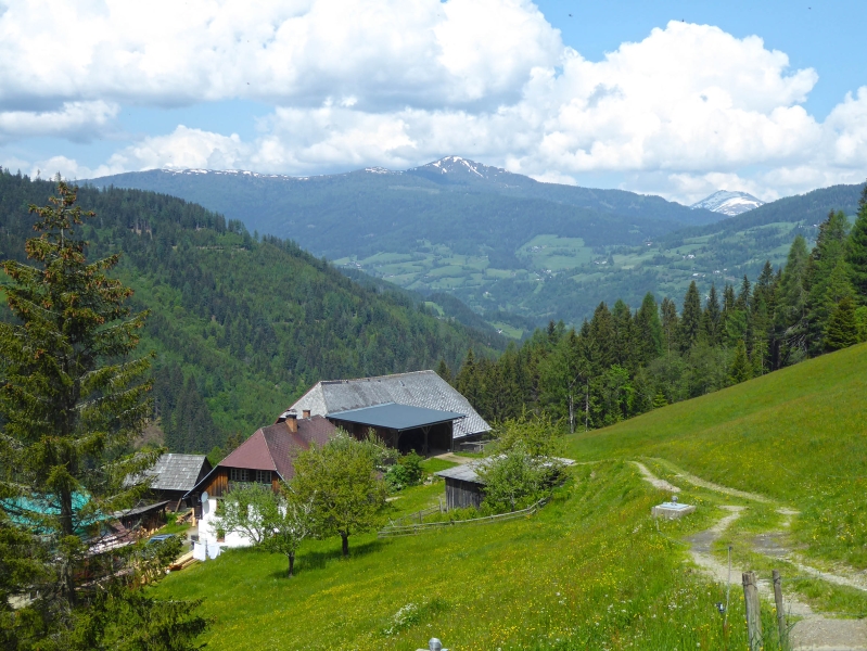 Von der Bahnstation St. Lorenzen ob Murau gehen wir die wenigen Schritte zur Hauptstraße, wo bereits der erste Wegweiser zur Frauenalpe situiert ist. Wir folgen der asphaltierten Straße hinein in den Lorenzengraben, bis wir nach ca. 20 Minuten zur Wegkreuzung nach dem Kleinkraftwerk gelangen (Hinweisschild „Fam. Feiel vulgo Reiter“, an dieser Stelle fehlt offensichtlich der Wegweiser zur Frauenalpe). Entlang der unasphaltierten Straße geht es zügig bergan, bei der ersten Kehre weist erstmals eine rot-gelbe Markierung auf unseren Wanderweg hin. Etwas später, beim schön gelegen Gehöft Grazer, ist wieder ein Wegweiser zu sehen. Kurz daraus erblicken wir ober uns das Gehöft Reiter; wir wandern vorerst geradeaus weiter, dann oberhalb des Hofes vorbei und erreichen nach gut 100 Höhenmetern Forststraßenwanderung die Grazerhütte (wohl nicht nach der Landeshauptstadt, sondern nach dem darunter liegenden Hof benannt), wo ein Bankerl für eine Rast genutzt werden kann.