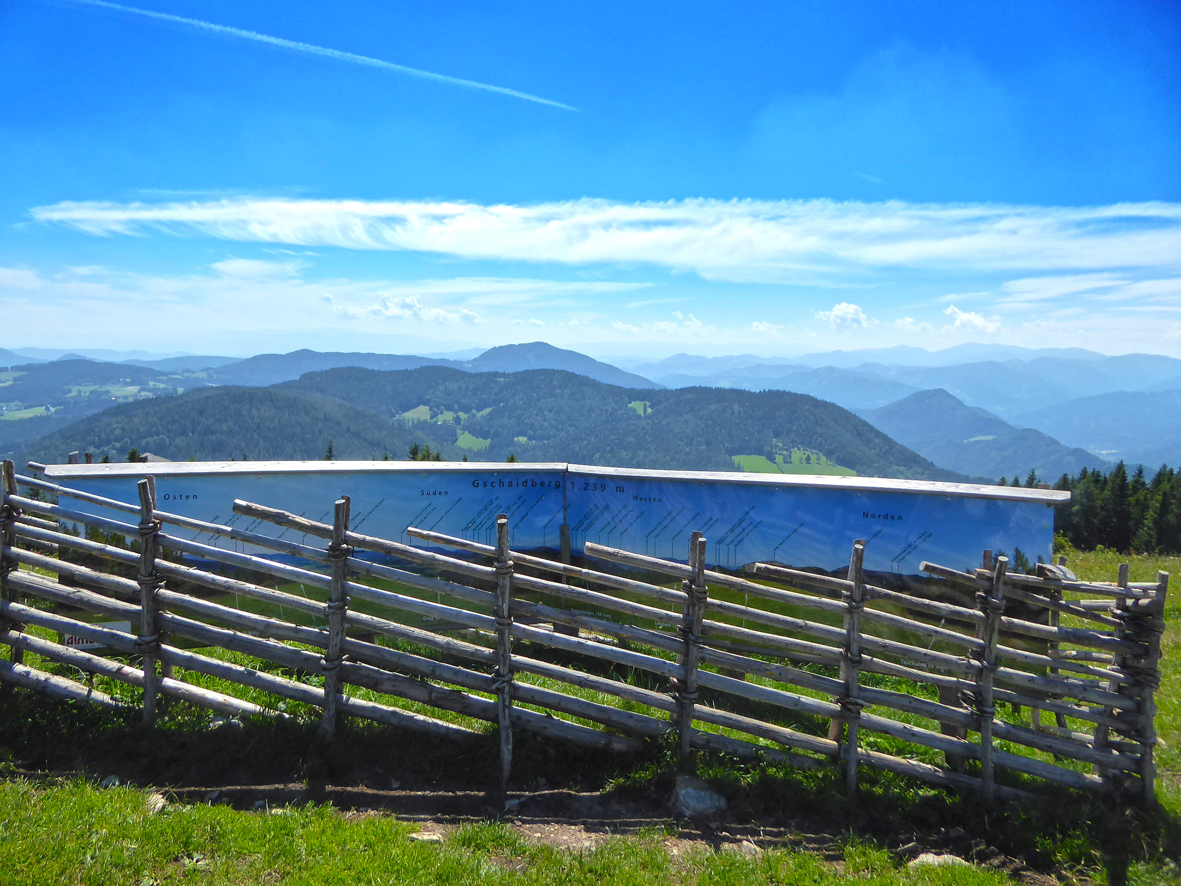Ausgangspunkt unserer Wanderung ist Nechnitz, eine malerische Hochfläche zwischen Rechberg und Teichalm, auf der auch zwei sympathische Gasthäuser (Frankenhof, Almenlandhof Haider) zur Einkehr einladen. Die neue Bushaltestelle der RegioBus-Linie 216 liegt gleich beim Beginn des reizvollen Holzskulpturenweges, dem wir uns auch anvertrauen, indem wir uns von Holzfigur zu Holzfigur entlanghanteln. Nach über 45 Skulpturen, die vor allem Waldtiere darstellen (zu denen es auch auf Tafeln interessante Infos zu lesen gibt), erreichen wir den Energiebrunnen, wo wir uns mit Getränken stärken können – und damit das Ende des Holzskulpturenweges. Von dort geht es in wenigen Minuten entlang des Waldrandes steil hinauf zum Gipfel des Gschaidkogels mit Gipfelkreuz, Bankerl und Panoramatafel.