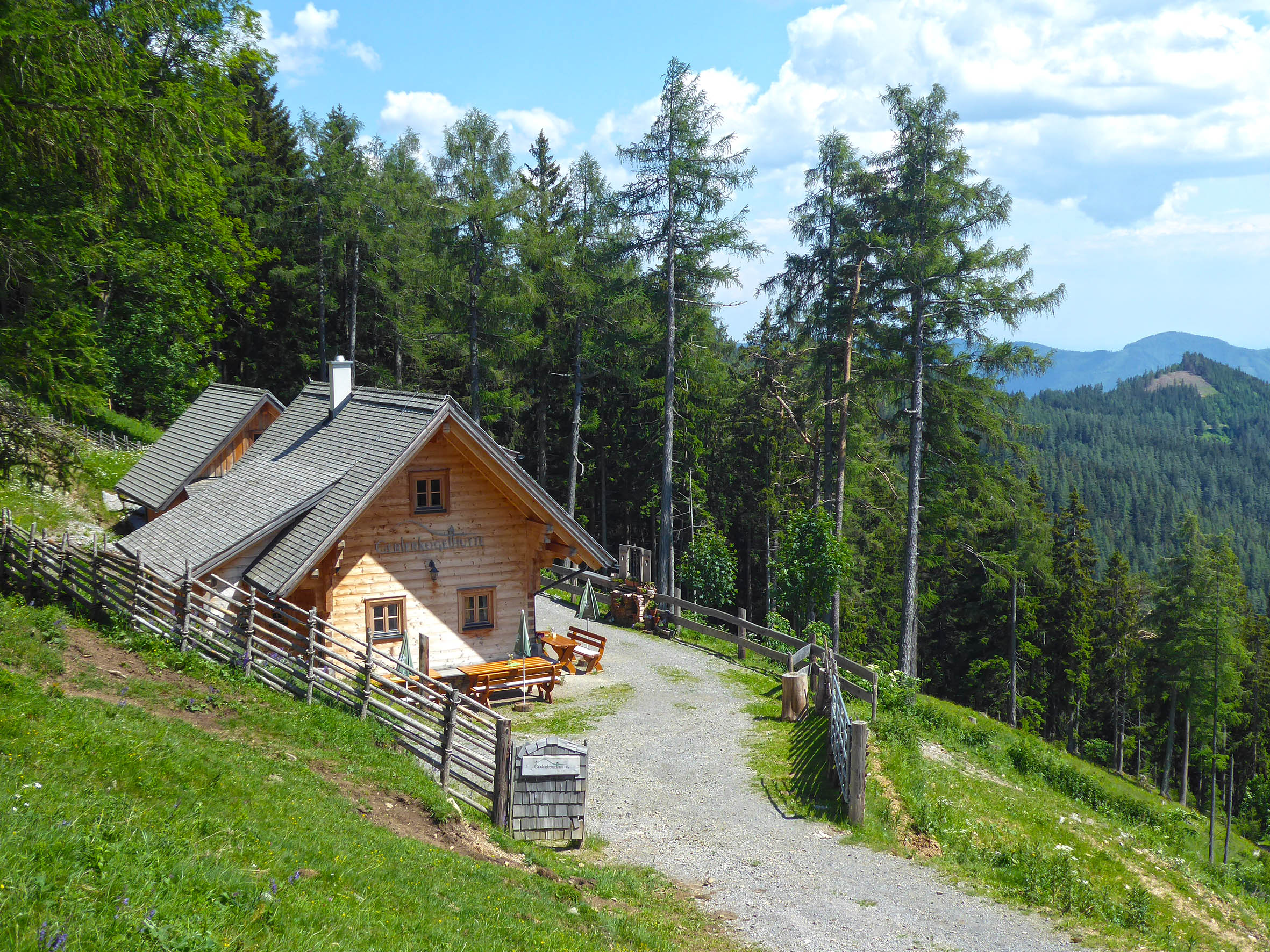 Nach der Gipfelrast wandern wir weiter über Almböden bzw. entlang des Almweges knapp rechts unter dem Kamm bis zu einem kleinen Bildstock mit Rastplatz, bei dem ebenfalls Getränke dargeboten werden (genügend Kleingeld für den Obolus mitnehmen). Wir wechseln nun auf die linke, westliche Seite des Höhenrückens und schreiten vorerst sanft bergab, dann leicht ansteigend zur Hubenhalt. Dort müssen wir scharf nach rechts abbiegen und fädeln wieder in einem Forstweg ein (Wegweiser), der weiterhin leicht ansteigend nach ein paar Minuten wieder die Schneid erreicht. Unser Wanderweg mündet daraufhin in eine Forststraße, wenig später erreichen wir die Wegkreuzung unterm Gerlerkogel, wo wir uns dem Holzwegweiser zur Gerlerkogelhütte anvertrauen und kurz darauf diese neue Jausenstation erreichen.