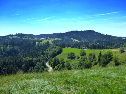 Wir bleiben vorerst weiterhin in Österreich und kommen nach ein paar Minuten wieder in einen Sattel mit Querungsmöglichkeit nach Slowenien. Dort können wir wählen, ob wir für den Weiterweg wieder eine Grenzüberschreitung wagen, oder eben diesseits weitergehen (schön sind beide Wege); im nächsten Sattel (Durchlass) vereinen sich unsere beiden Wanderwege. Diesmal bleiben wir auf der österreichischen Seite, um kurz bergauf zu einer schönen Wiese mit entsprechender Aussicht zu steigen. Gleich darauf erreichen wir wieder die Grenze, diesmal gehen wir geradeaus auf der slowenischen Seite weiter und stehen alsbald beim ehemaligen slowenischen Grenzhaus des Übergangs Arnfels – Kapla.