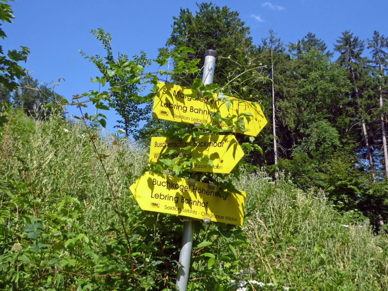 Der Wegweiser vor dem Buschenschank (Bahnhof Wildon – Fußweg, Buchkogel, Bahnhof Lebring) weist auf unseren Weiterweg hin. Es geht geradeaus bergauf, an einem interessanten Steinbruch vorbei. Bei einem Schlag wenden wir uns links (Wegweiser „Buchkogel Höhenweg“) und kurz darauf erreichen wir den Höhenrücken (Wegweiser). Dort können wir in wenigen Minuten den mit einem Gipfelzeichen inszenierten Gipfel erreichen. Unsere Wanderung führt hingegen rechts weiter, und wir queren das waldreiche Plateau des Buchkogels, bis ein Markierungspfeil Richtung Lebring uns den Abstiegsweg zeigt. Es geht wieder an einem alten, malerischen Steinbruch vorbei sowie über zwei Kehren zu einer Kreuzung mit einem asphaltierten Straßerl. Nun wenden wir uns nach rechts (Wegweiser "Naturfreunde Rundweg") gehen ein kurzes Stück bergauf bis zur nächsten Kreuzung, wo die Wegweiser wieder Richtung Bockmoar weisen. Wir folgen jedoch der bergab führenden Straße nach links, über die wir zur Kirche St. Margarethen und zur Dorfstraße gelangen. Kurz geht es dieser entlang Richtung Süden, ehe wir links in die Straße Namens "Stiergraben" einbiegen. Nach der Kreuzung mit der Margarethenstraße ändert sich der Straßenname in "Bahnweg"; wenige Minuten später ist die S-Bahn-Haltestelle (S-Bahn S1) und damit der Endpunkt unserer Wanderung erreicht.