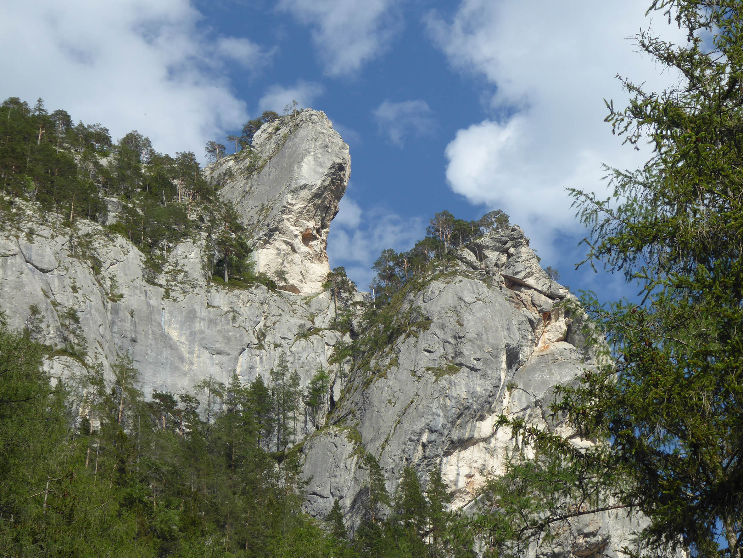 Nach der Stärkung im traditionsreichen Gasthaus vertrauen wir uns dem Marterlsteig (Weg Nr. 278) an, der vorerst steil bergab führt (beim Einstieg auf kleinen Wegweiser achten – unterwegs Blicke zu den überhängenden Wänden des Gindlhorns und Jungfernsturzes) und uns dann, deutlich bequemer, hinüber zum Parkplatz von Pürgg geleitet. Wir spazieren in den intakten und schönen Ortskern, wo sich das Gasthaus Krenn als exzellente Labestation anbietet und wir auch die zahlreichen Häuser sowie die Pfarrkirche besichtigen können. Die kulturhistorisch herausragende Kirche St. Johannes liegt etwas außerhalb östlich des Dorfes.